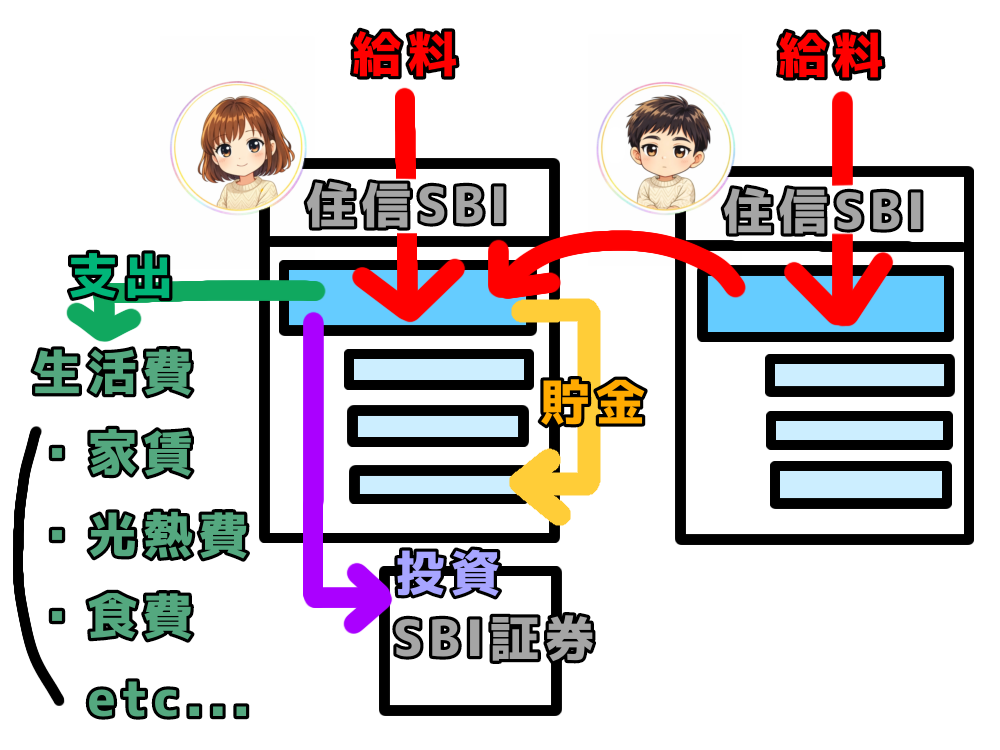 (住信SBIネット口座のサービス「目的別口座」を活用) - 投資:「紫色」の矢印