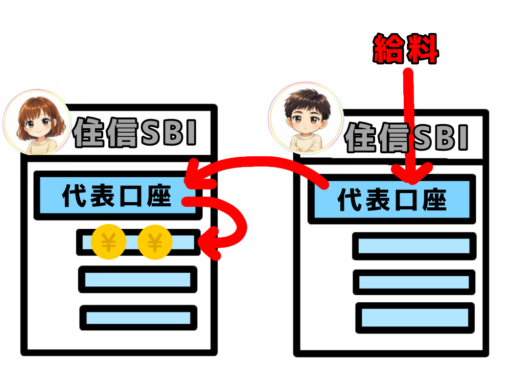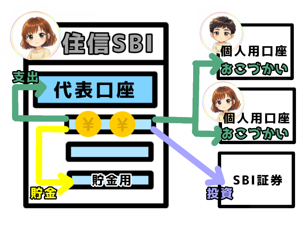おこづかいは、家計口座から個人用口座に振込むけど、住信SBIネット銀行なら「スマホで数クリック&手数料無料」で便利だよ。
